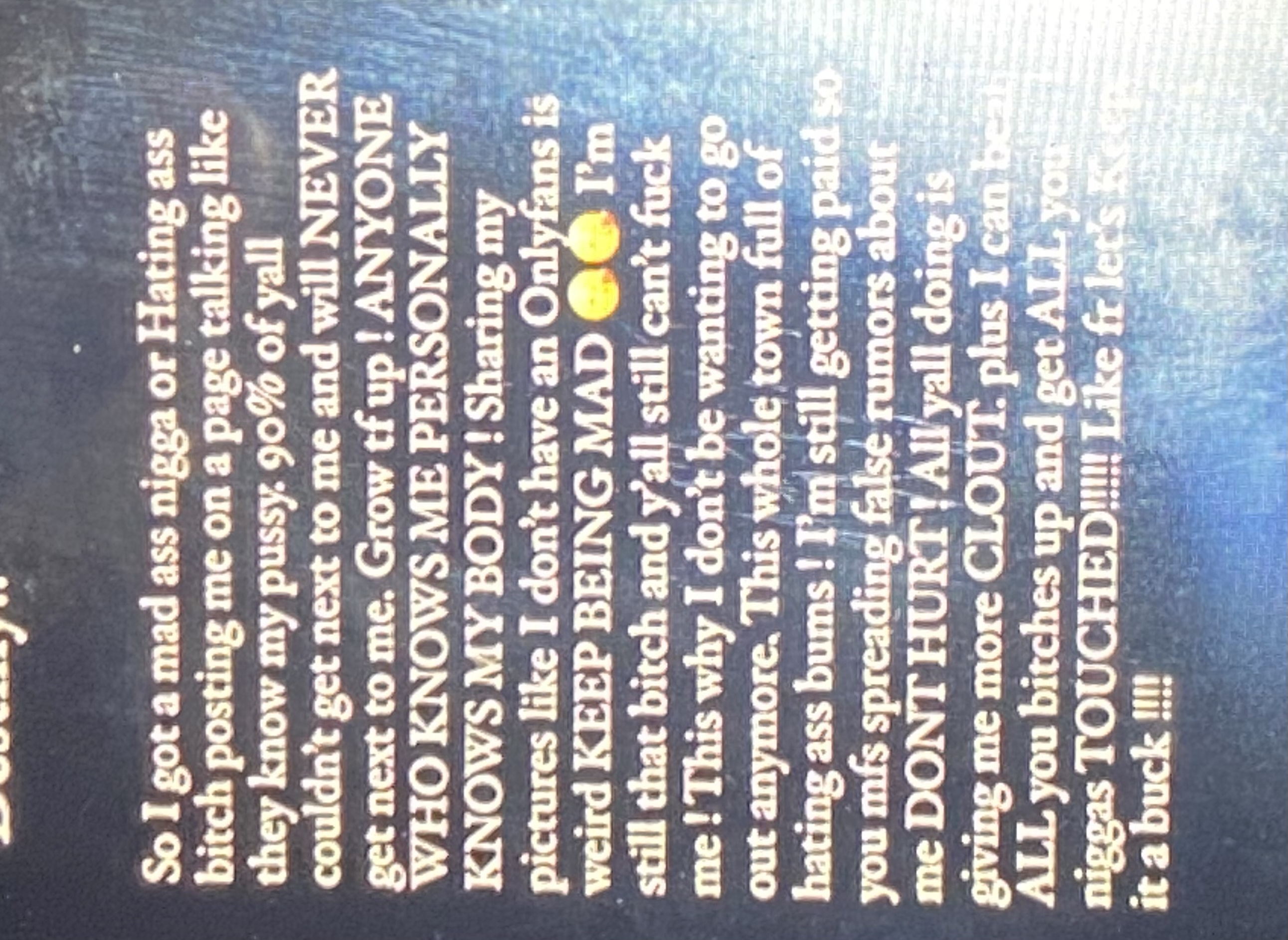{{{">>18043\nAir it out then bitch! You the main one who needs to be exposed. Sleeping with bitches men" | renderPostMessage 18728}}} |
